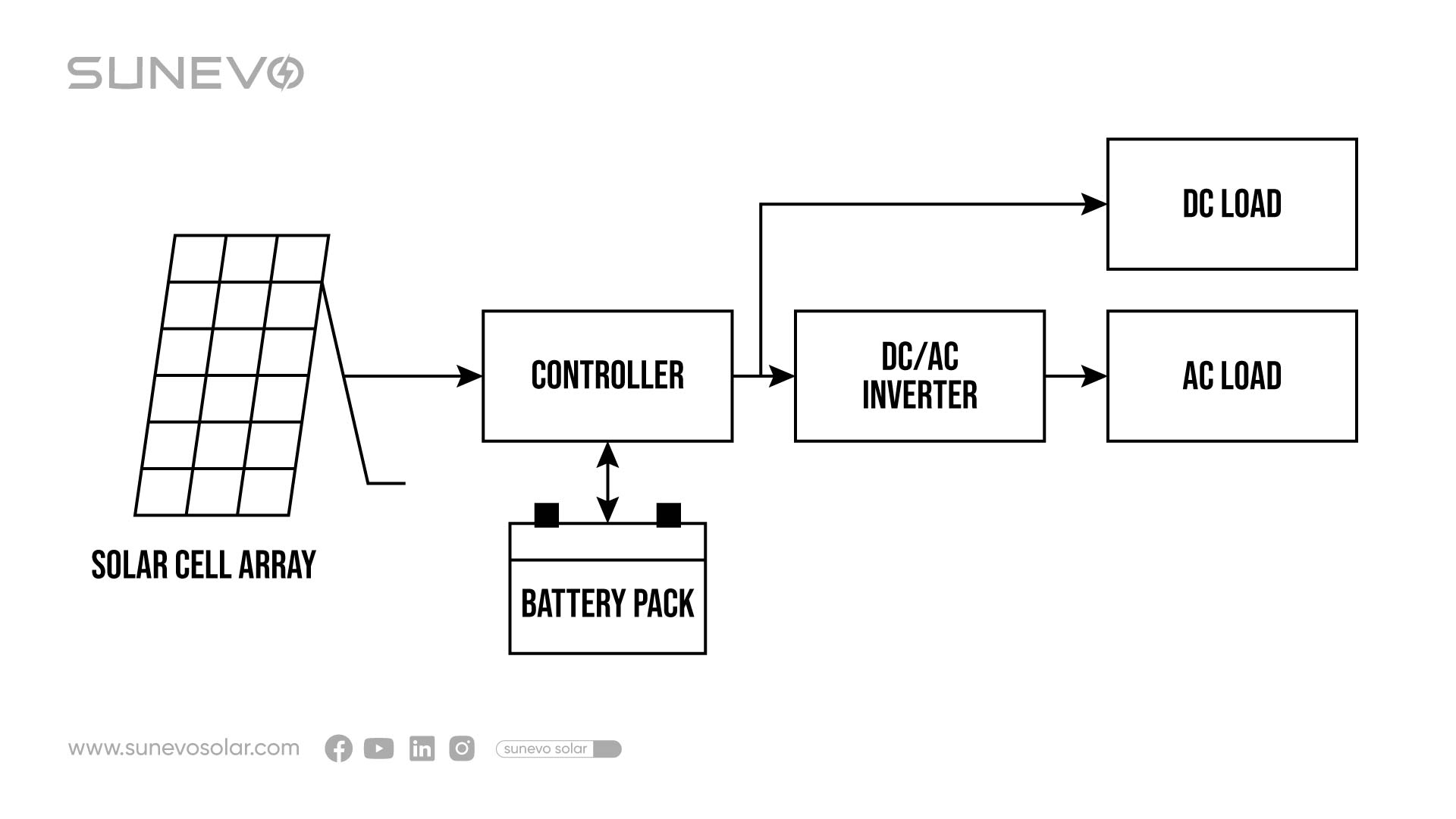 The Flow: Modules → Inverter → Combiner Box → Bi-directional Meter → Grid.
